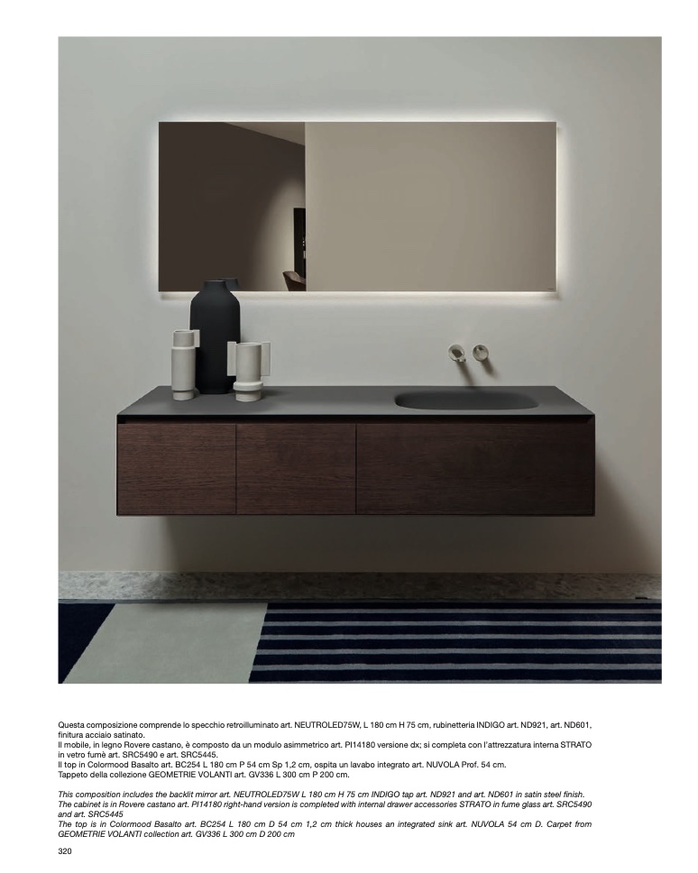 Questa composizione comprende lo specchio retroilluminato art. NEUTROLED75W, L 180 cm H 75 cm, rubinetteria INDIGO art. ND921, art. ND601,