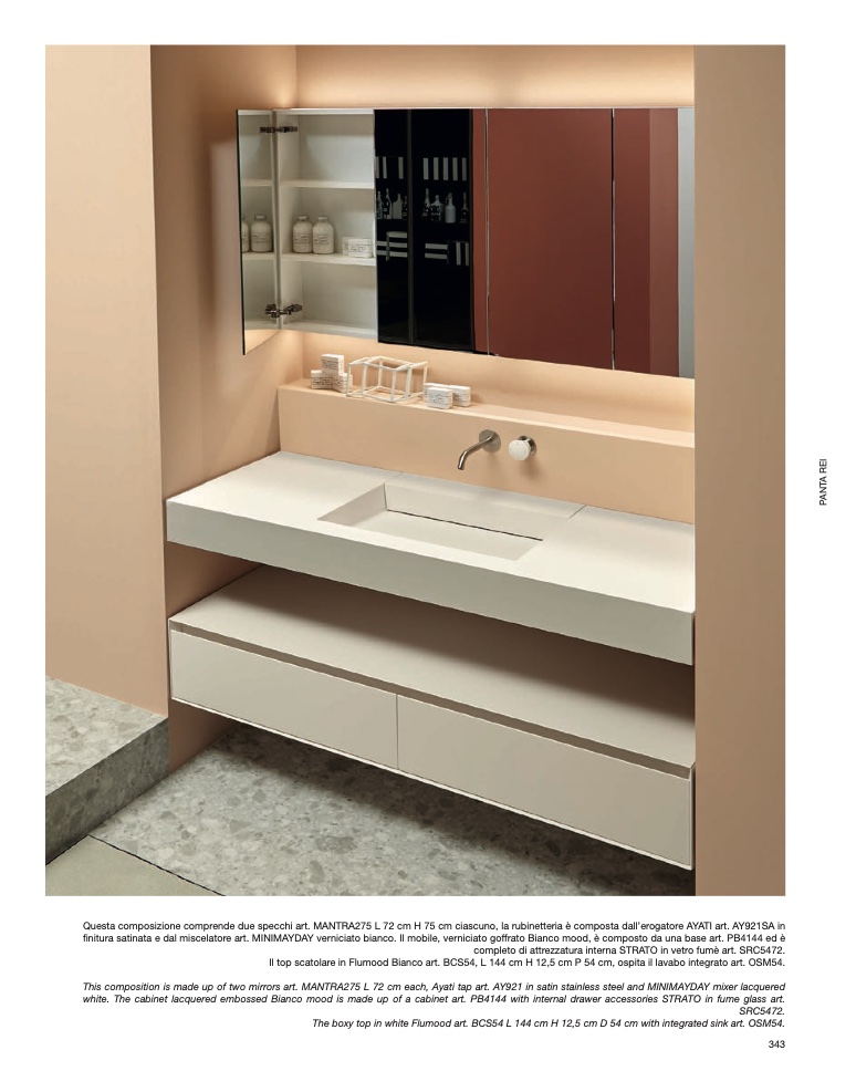 finitura satinata e dal miscelatore art. MINIMAYDAY verniciato bianco. Il mobile, verniciato goffrato Bianco mood, è composto da una base art. PB4144 ed è