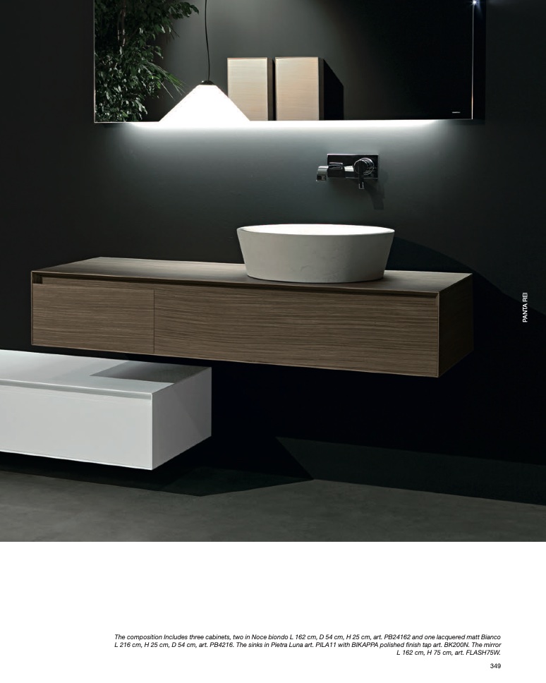 L 216 cm, H 25 cm, D 54 cm, art. PB4216. The sinks in Pietra Luna art. PILA11 with BIKAPPA polished finish tap art. BK200N. The mirror