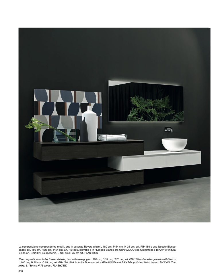 opaco di L 180 cm, H 25 cm, P 54 cm, art. PB4180. Il lavabo è in Flumood Bianco art. URNAMOOD e la rubinetteria