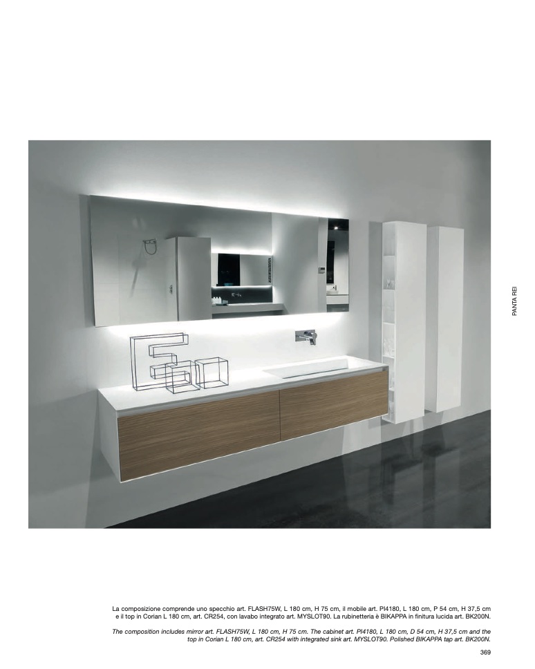 The composition includes mirror art. FLASH75W, L 180 cm, H 75 cm. The cabinet art. PI4180, L 180 cm, D 54 cm, H 37,5 cm and the