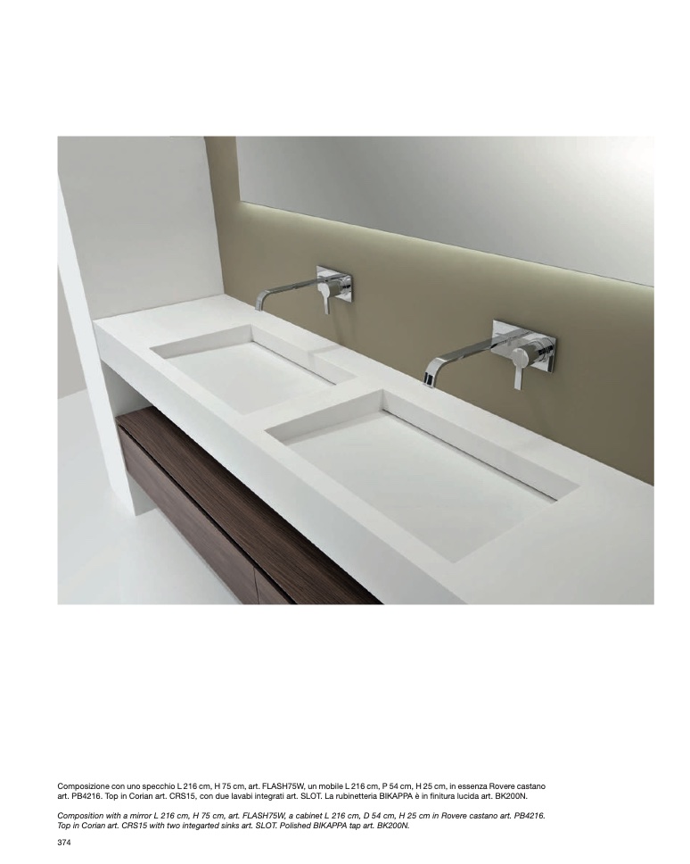 art. PB4216. Top in Corian art. CRS15, con due lavabi integrati art. SLOT. La rubinetteria BIKAPPA