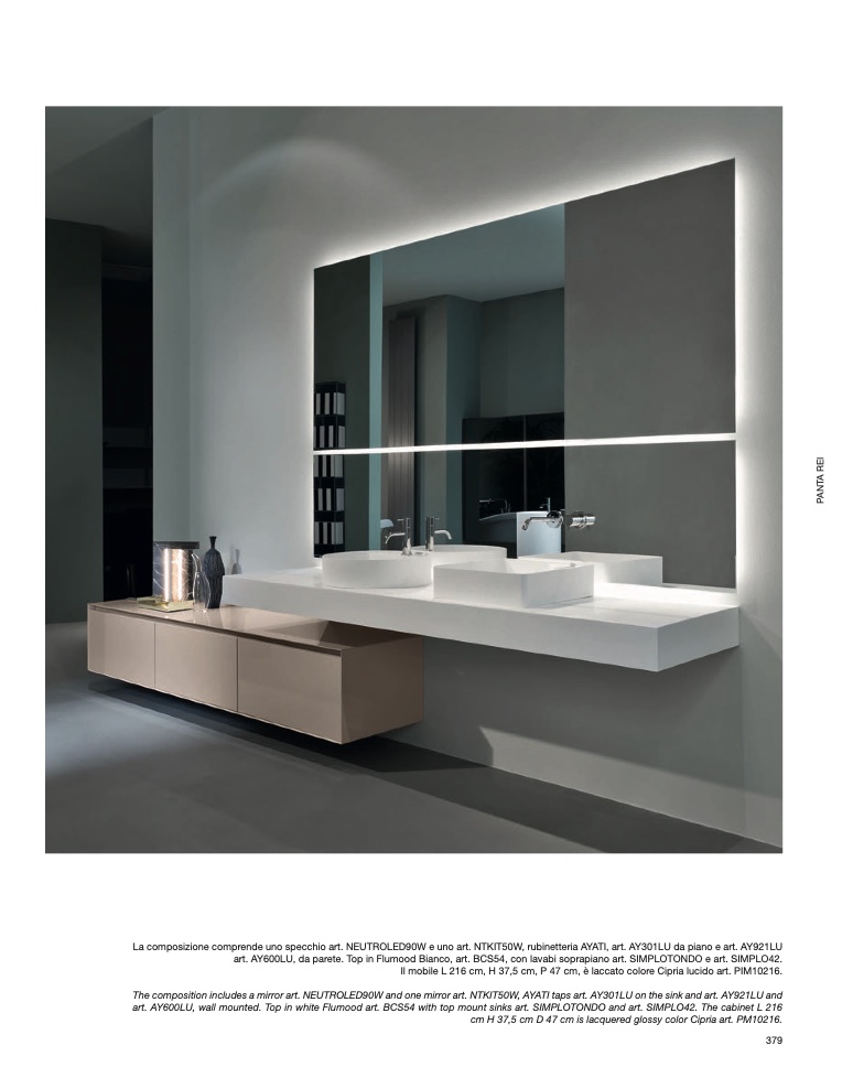 art. AY600LU, da parete. Top in Flumood Bianco, art. BCS54, con lavabi soprapiano art. SIMPLOTONDO e art. SIMPLO42.