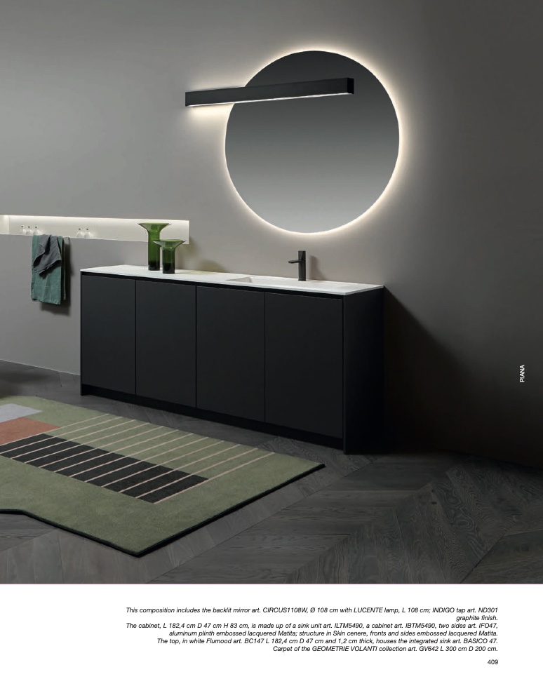This composition includes the backlit mirror art. CIRCUS1108W, Ø 108 cm with LUCENTE lamp, L 108 cm; INDIGO tap art. ND301