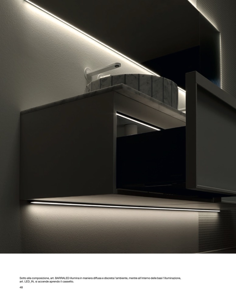 Sotto alla composizione, art. BARRALED illumina in maniera diffusa e discreta l’ambiente, mentre all’interno delle basi l’illuminazione,