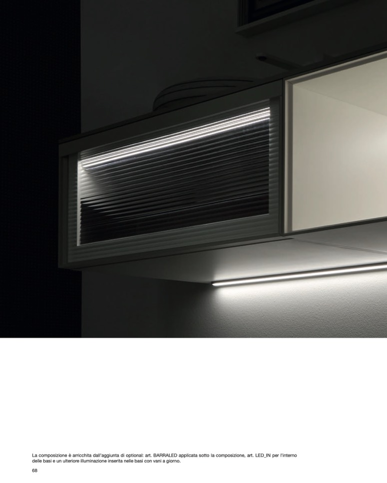 La composizione è arricchita dall’aggiunta di optional: art. BARRALED applicata sotto la composizione, art. LED_IN per l’interno