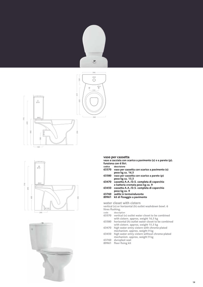vaso a cacciata con scarico a pavimento (s) o a parete (p).