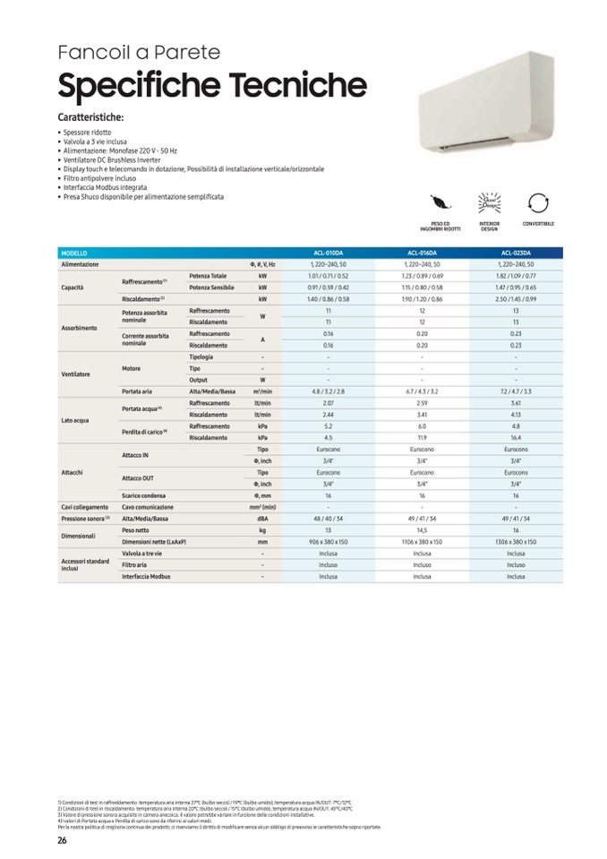 3) Valore di pressione sonora acquisito in camera anecoica. Il valore potrebbe variare in funzione delle condizioni installative.