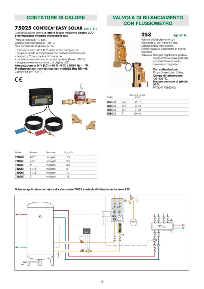 Schema applicativo contatore di calore serie 75025 e valvola di bilanciamento serie 258