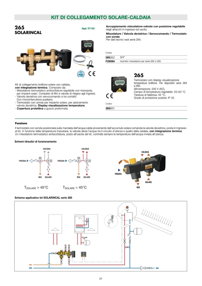 al kit. In funzione della temperatura impostata, la valvola devia l’acqua tra il circuito d’utenza e quello della caldaia, con integrazione termica.