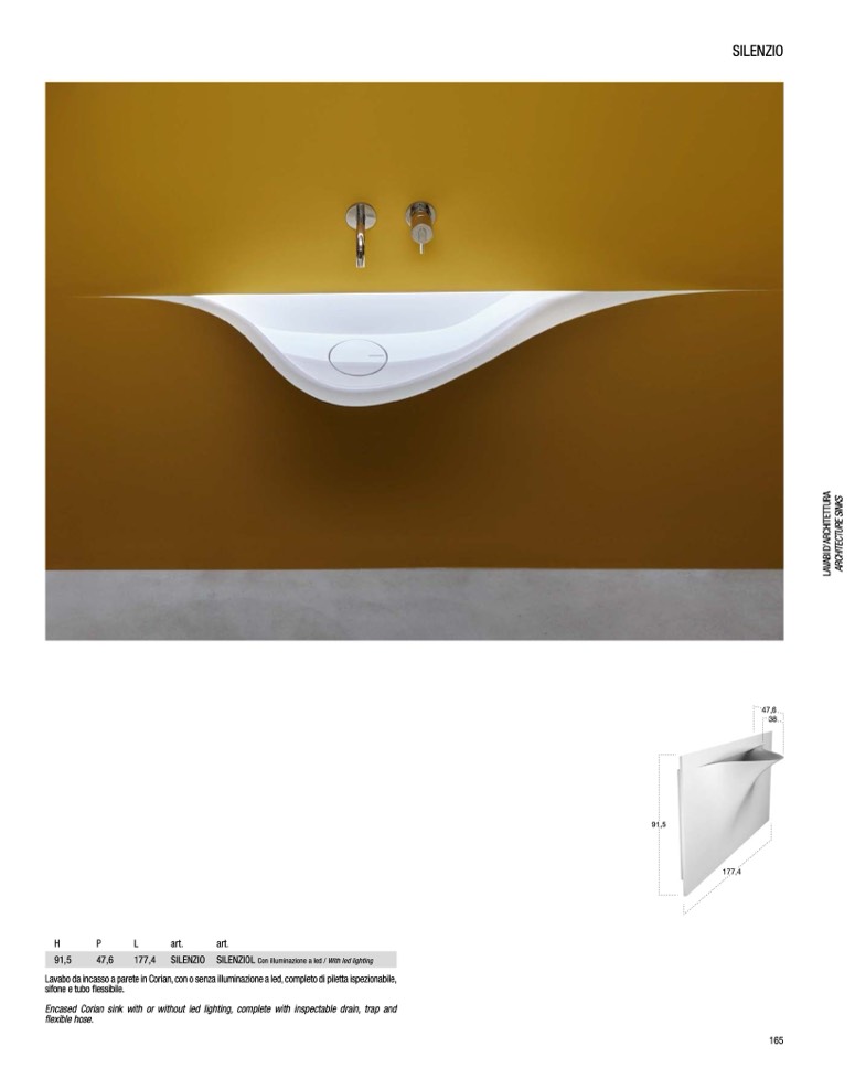 Lavabo da incasso a parete in Corian, con o senza illuminazione a led, completo di piletta ispezionabile,