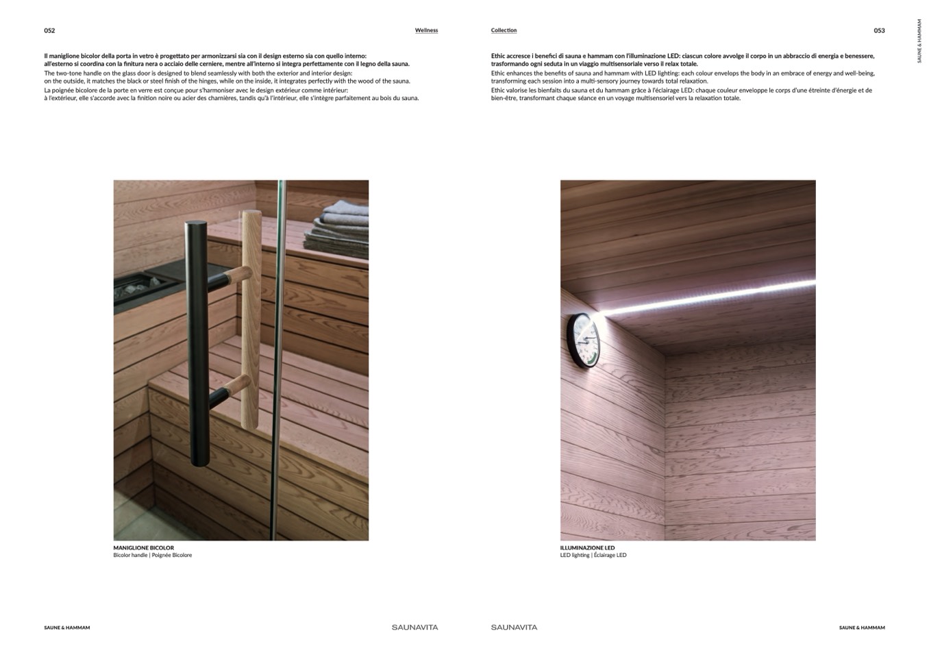 finish of the hinges, while on the inside, it integrates perfectly with the wood of the sauna.