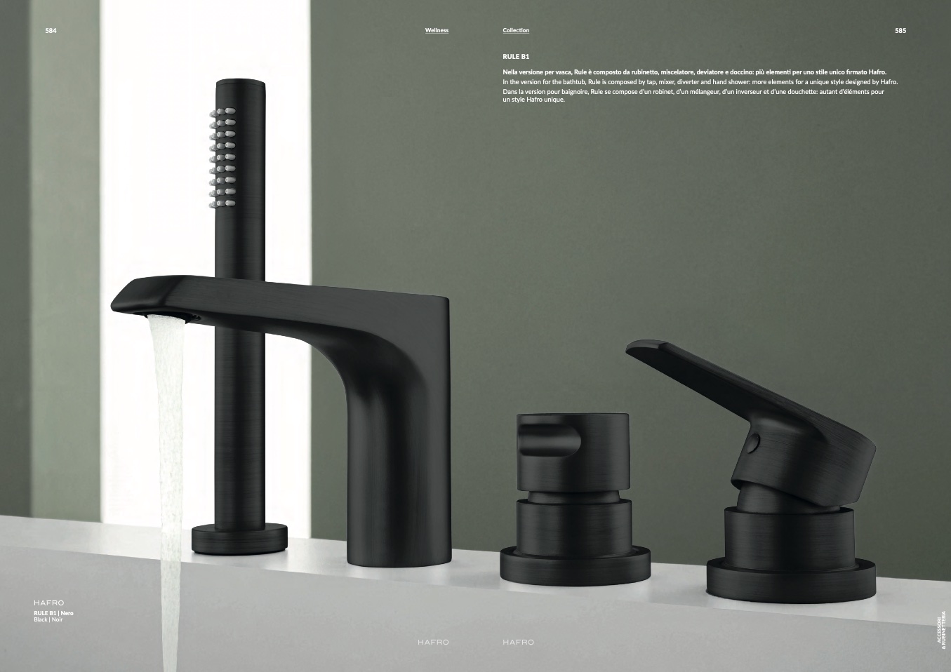 In the version for the bathtub, Rule is composed by tap, mixer, diverter and hand shower: more elements for a unique style designed by Hafro.