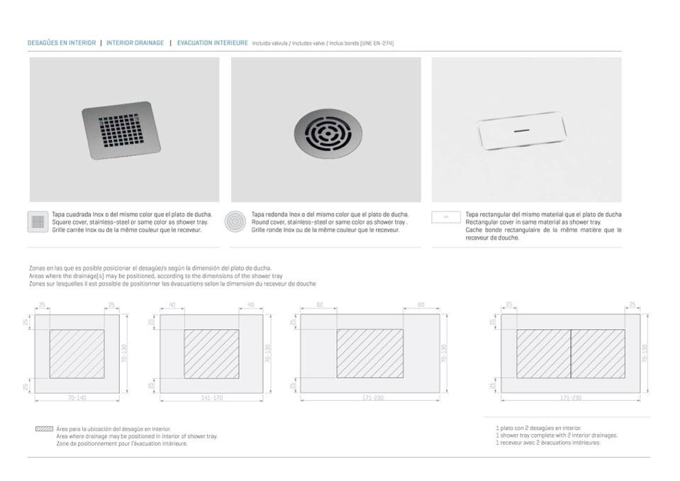 Zonas en las que es posible posicionar el desagüe/s según la dimensión del plato de ducha.