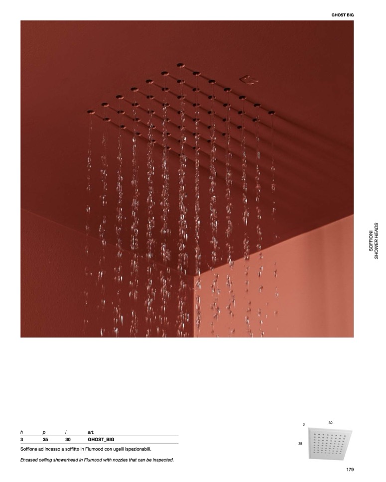 Soffione ad incasso a soffitto in Flumood con ugelli ispezionabili.