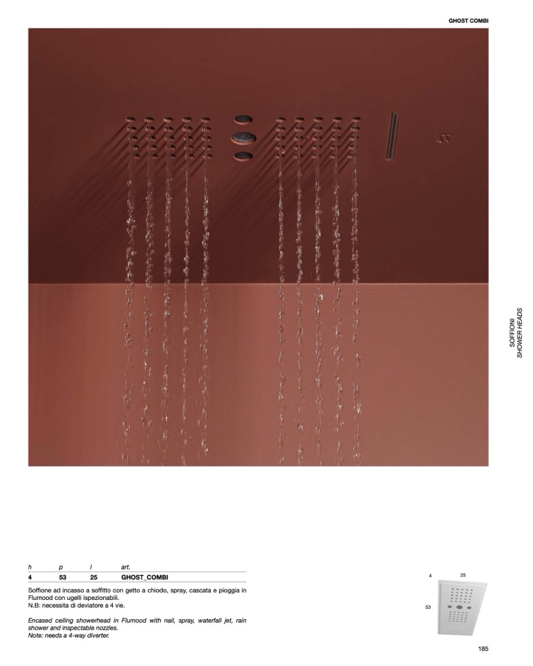 Encased ceiling showerhead in Flumood with nail, spray, waterfall jet, rain