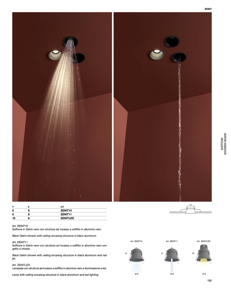 Soffione in Delrin nero con struttura ad incasso a soffitto in alluminio nero.