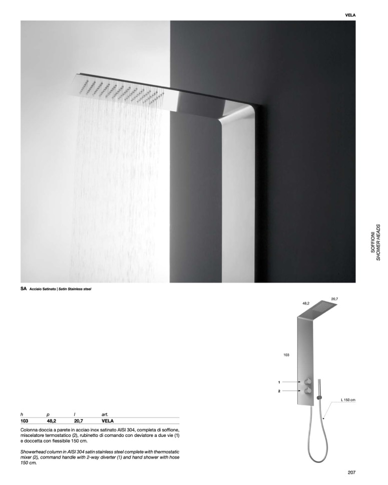 Colonna doccia a parete in acciao inox satinato AISI 304, completa di soffione,
