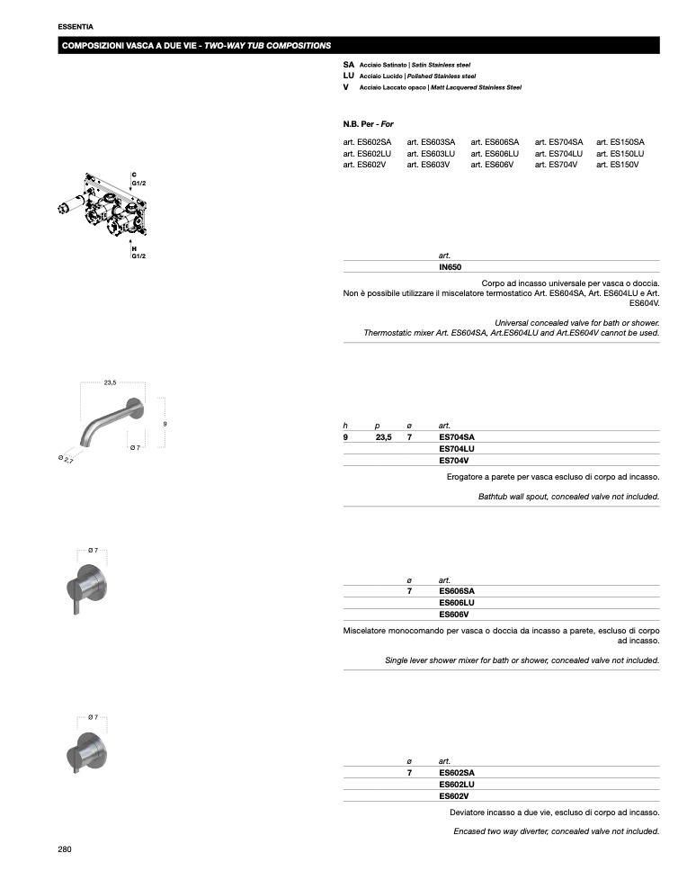Thermostatic mixer Art. ES604SA, Art.ES604LU and Art.ES604V cannot be used.