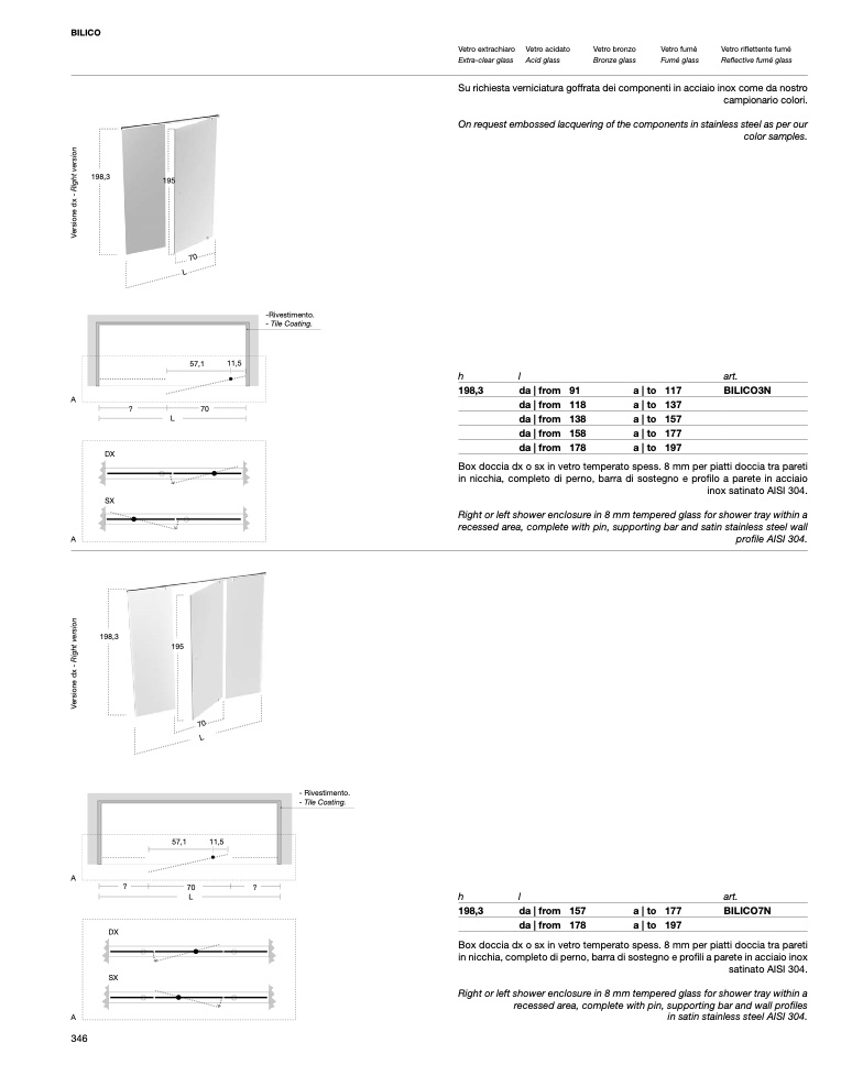 Box doccia dx o sx in vetro temperato spess. 8 mm per piatti doccia tra pareti