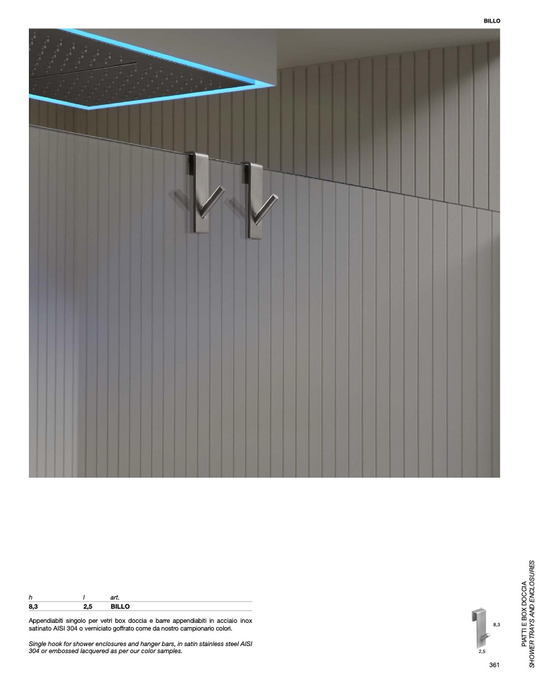 Single hook for shower enclosures and hanger bars, in satin stainless steel AISI