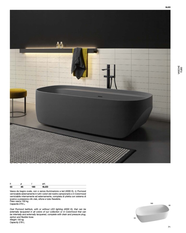 Vasca da bagno ovale, con o senza illuminazione a led (4000 K), in Flumood