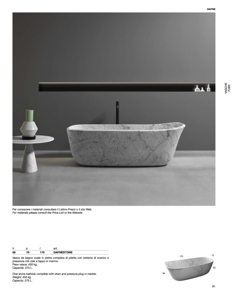 Vasca da bagno ovale in pietra completa di piletta con sistema di scarico a
