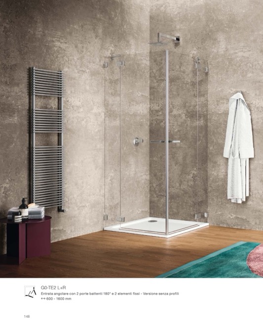 Entrata angolare con 2 porte battenti 180° e 2 elementi fissi - Versione senza profili