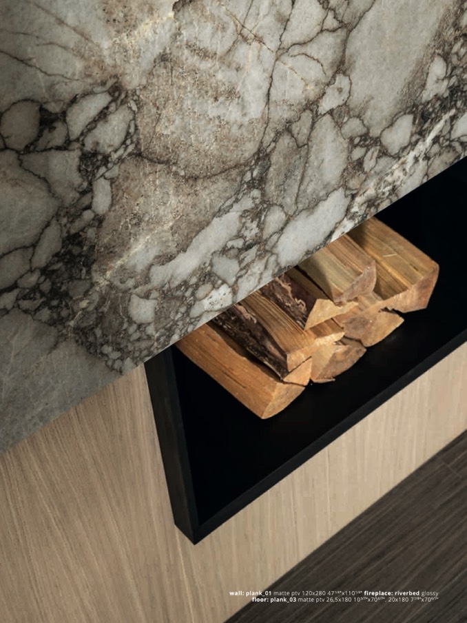 wall: plank_01 matte ptv 120x280 471/4”x1101/4” fireplace: riverbed gloss