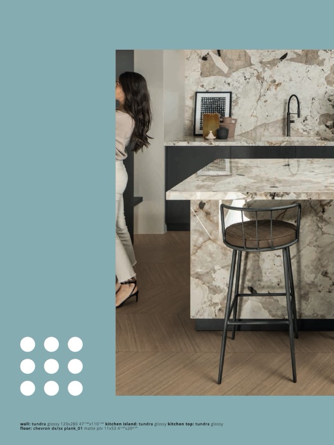 wall: tundra glossy 120x280 471/4”x1101/4” kitchen island: tundra glossy kitchen top: tundra glossy