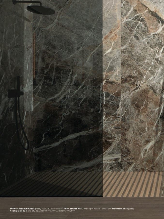 shower: mountain peak glossy 120x280 471/4”x1101/4” floor: stripes mix 2 matte ptv 40x40 153/4”x153/4” mountain peak glossy