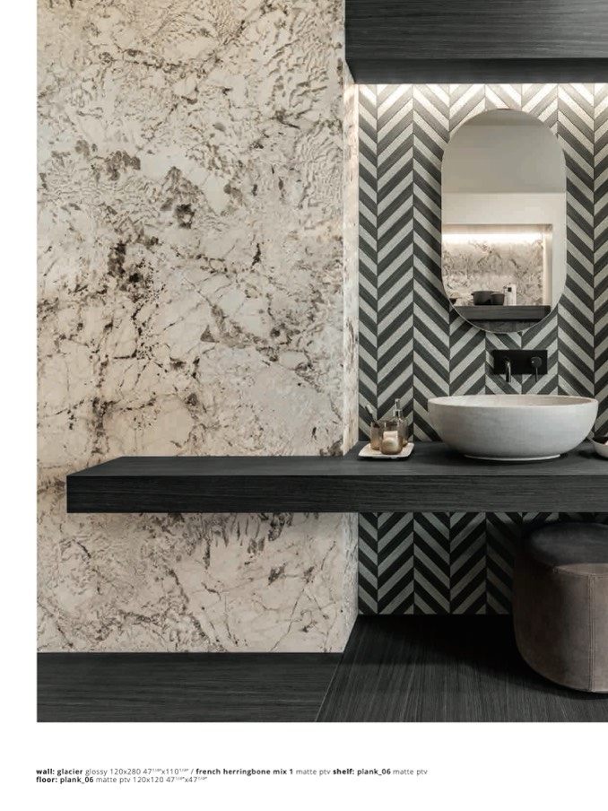 wall: glacier glossy 120x280 471/4”x1101/4” / french herringbone mix 1 matte ptv shelf: plank_06 matte ptv