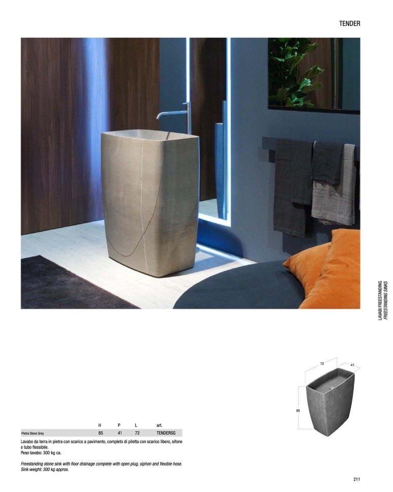 Lavabo da terra in pietra con scarico a pavimento, completo di piletta con scarico libero, sifone