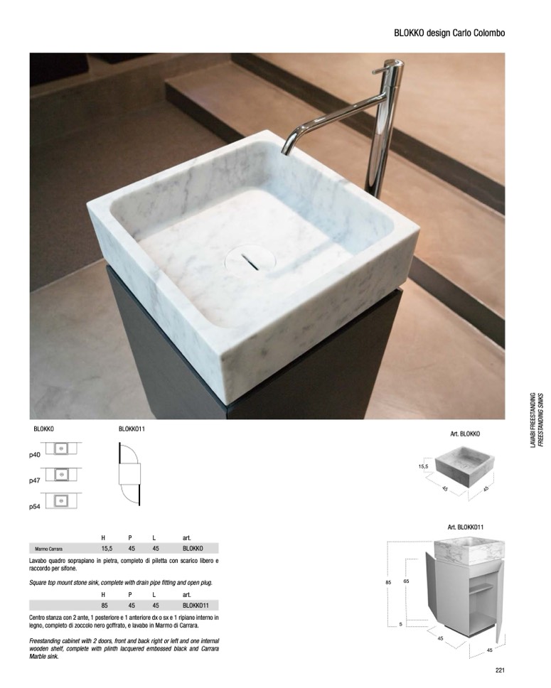 Lavabo quadro soprapiano in pietra, completo di piletta con scarico libero e