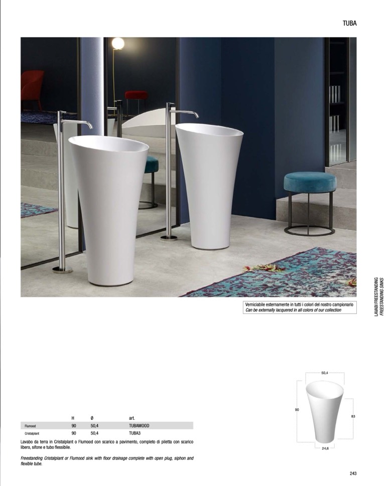 Freestanding Cristalplant or Flumood sink with floor drainage complete with open plug, siphon and