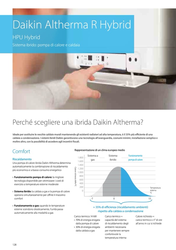caldaia a condensazione. I sistemi ibridi Daikin garantiscono una tecnologia all'avanguardia, cosnumi minimi, installazione semplice e