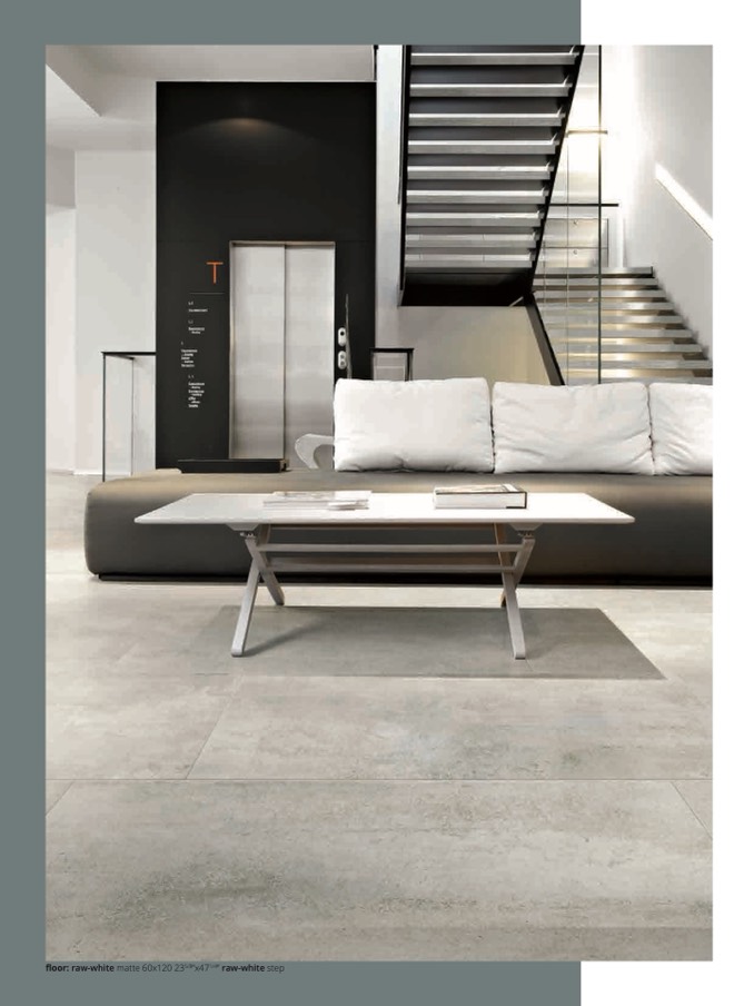 floor: raw-white matte 60x120 235/8”x471/4” raw-white step