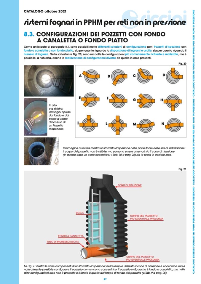 La Fig. 21 illustra le varie componenti di un Pozzetto d’ispezione; nell’esempio utilizzato il cono di riduzione