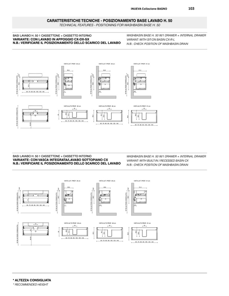 BASI LAVABO H. 50 1 CASSETTONE + CASSETTO INTERNO
