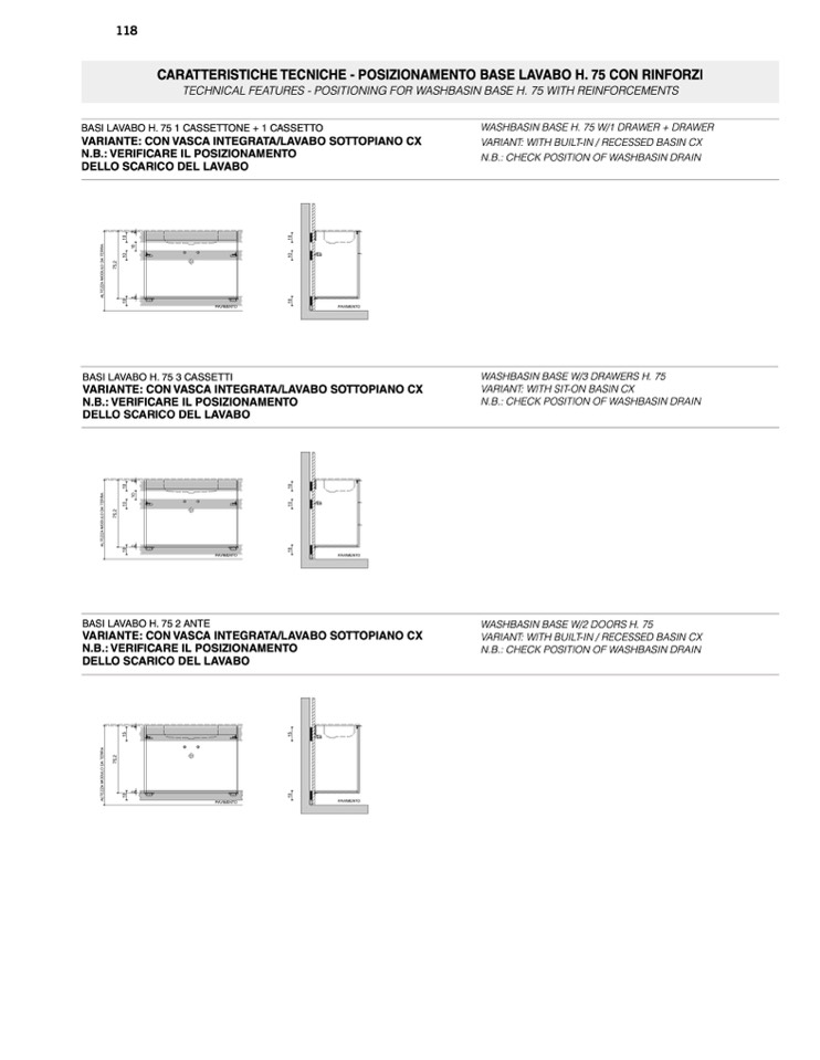 TECHNICAL FEATURES - POSITIONING FOR WASHBASIN BASE H. 75 WITH REINFORCEMENTS