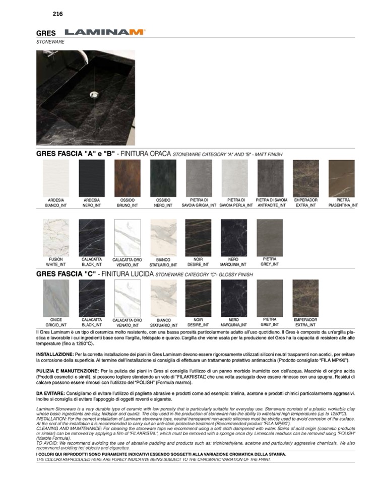 INSTALLAZIONE: Per la corretta installazione dei piani in Gres Laminam devono essere rigorosamente utilizzati siliconi neutri trasparenti non acetici, per evitare