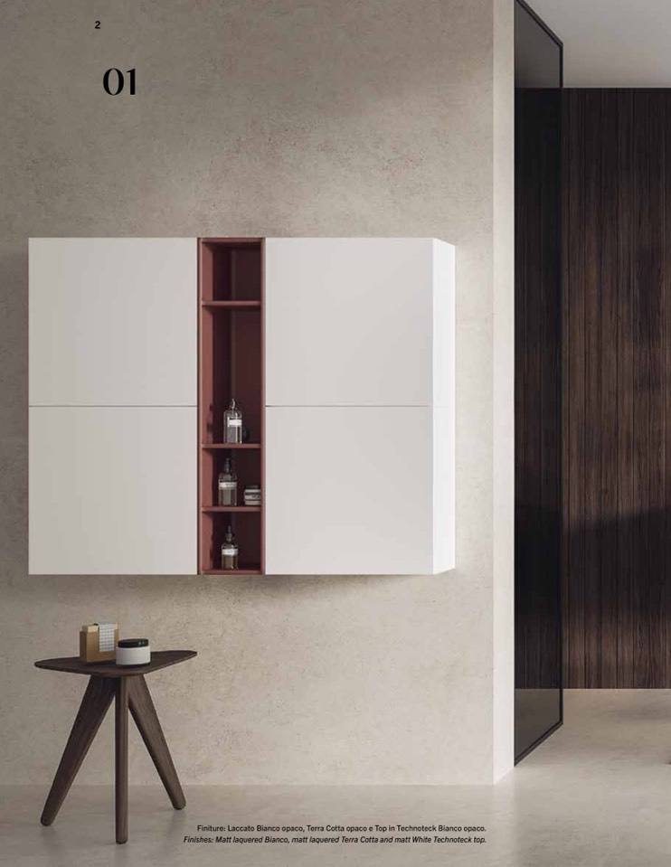 Finiture: Laccato Bianco opaco, Terra Cotta opaco e Top in Technoteck Bianco opaco.