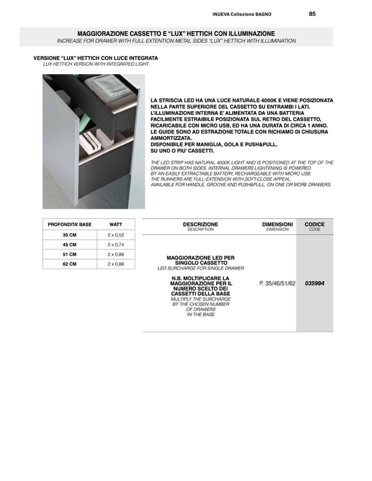 INCREASE FOR DRAWER WITH FULL EXTENTION METAL SIDES “LUX” HETTICH WITH ILLUMINATION