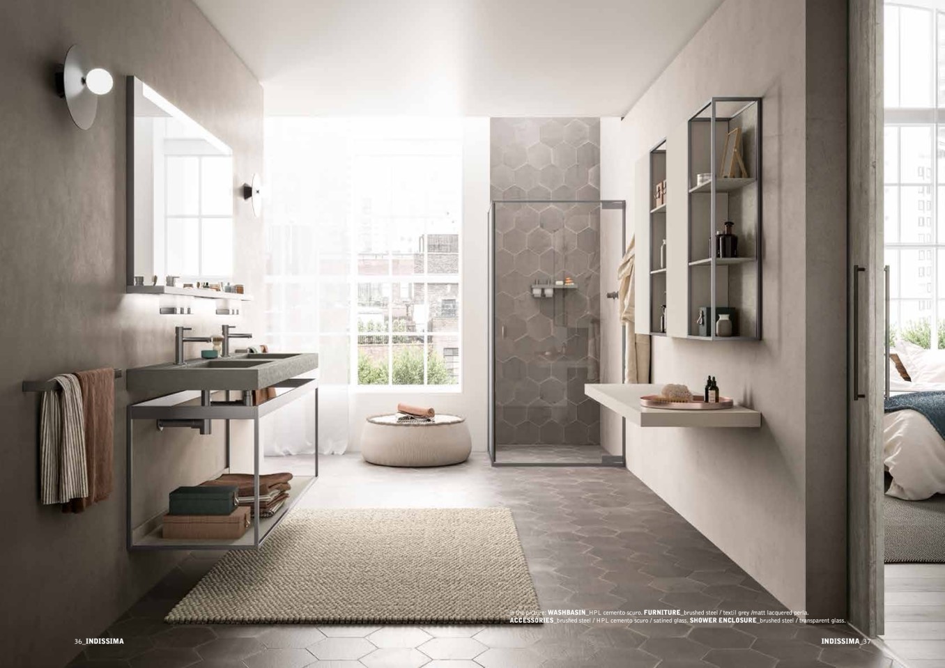 ACCESSORIES_brushed steel / HPL cemento scuro / satined glass. SHOWER ENCLOSURE_brushed steel / transparent glass.