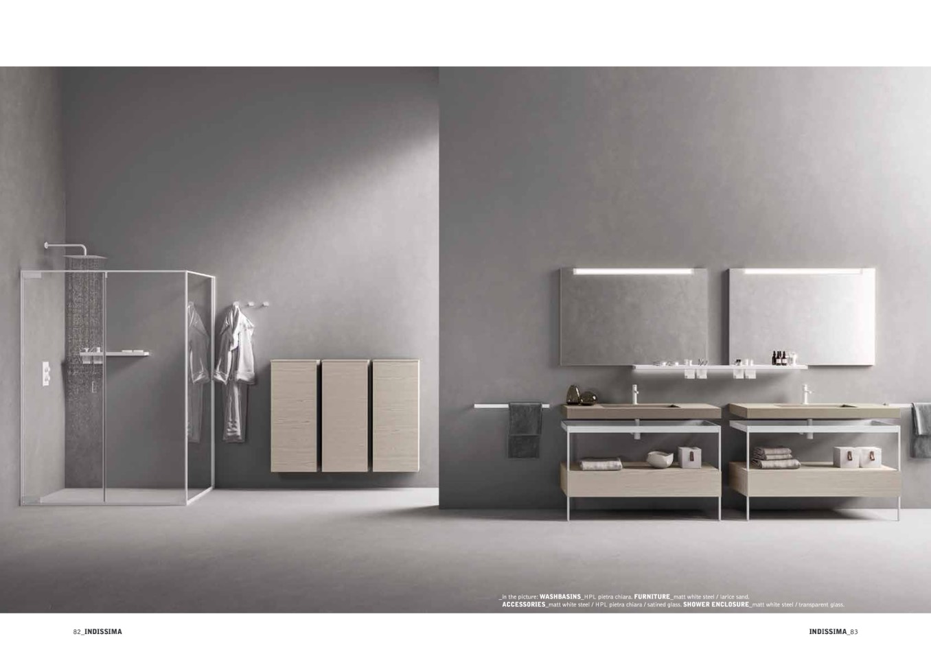 ACCESSORIES_matt white steel / HPL pietra chiara / satined glass. SHOWER ENCLOSURE_matt white steel / transparent glass.