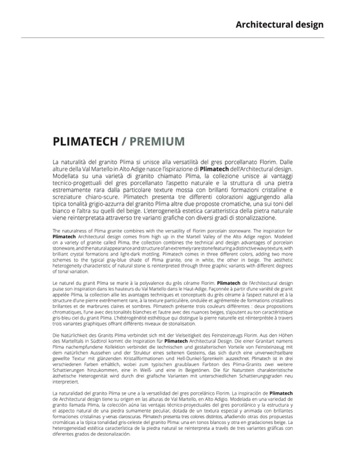La naturalidad del granito Plima se une a la versatilidad del gres porcelánico Florim. La inspiración de Plimatec
