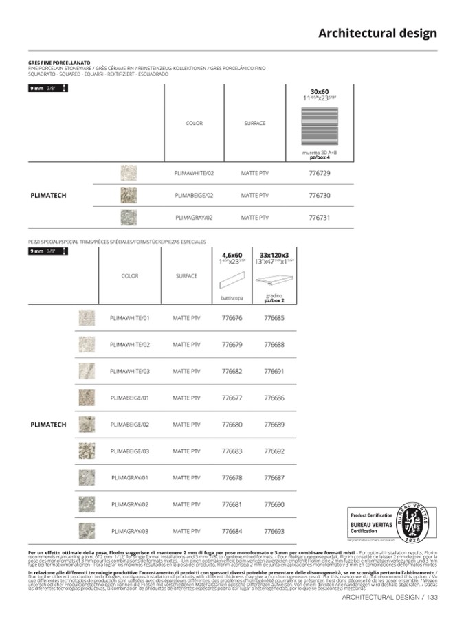 recommends maintaining a joint of 2 mm 1/12” for single format installations and 3 mm 1/8” to combine mixed formats. - Pour réaliser une pose parfait, Florim conseille de laisser 2 mm de joint pour l