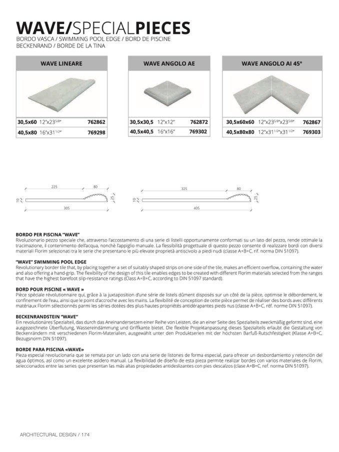 Beckenrändern mit verschiedenen Florim-Materialien, ausgewählt unter den Produktserien mit der höchsten Barfuß-Rutschfestigkeit (Klasse A+B+C