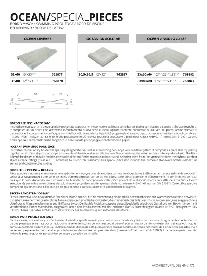 slip-resistance ratings (Class A+B+C, according to DIN 51097 standard). This special piece also includes the porcelain stoneware corner element for