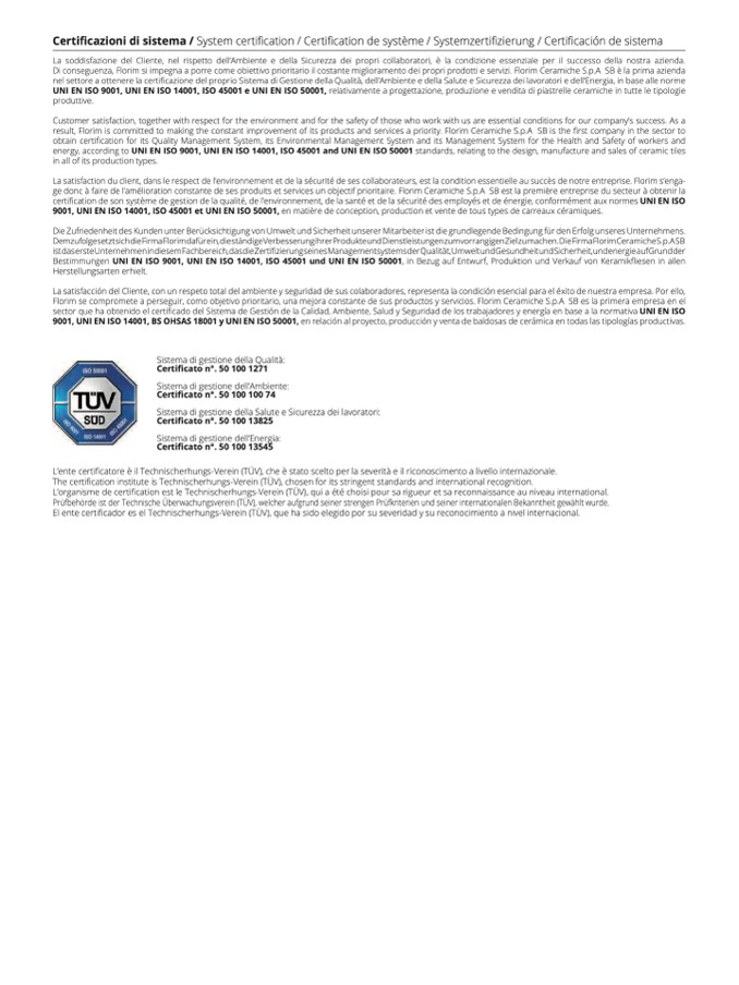 9001, UNI EN ISO 14001, ISO 45001 et UNI EN ISO 50001, en matière de conception, production et vente de tous types de carreaux céramiques